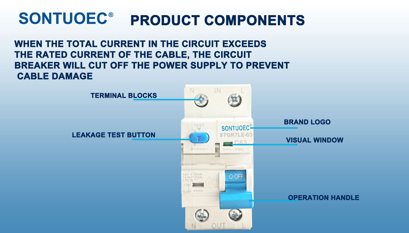 Ulinzi wa kupindukia: Wakati wa sasa katika mzunguko unazidi thamani iliyokadiriwa ya Stro7LE-63 RCBO, itakata moja kwa moja mzunguko ndani ya muda uliowekwa kuzuia mzunguko na vifaa kutoka kwa overheating, na hivyo kuzuia moto na uharibifu.